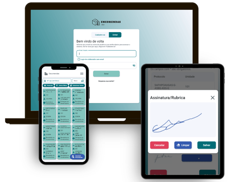 Todo o histórico da encomenda registrado no app, com controle da entrada, movimentação interna e entrega para o morador (com assinatura na tela).